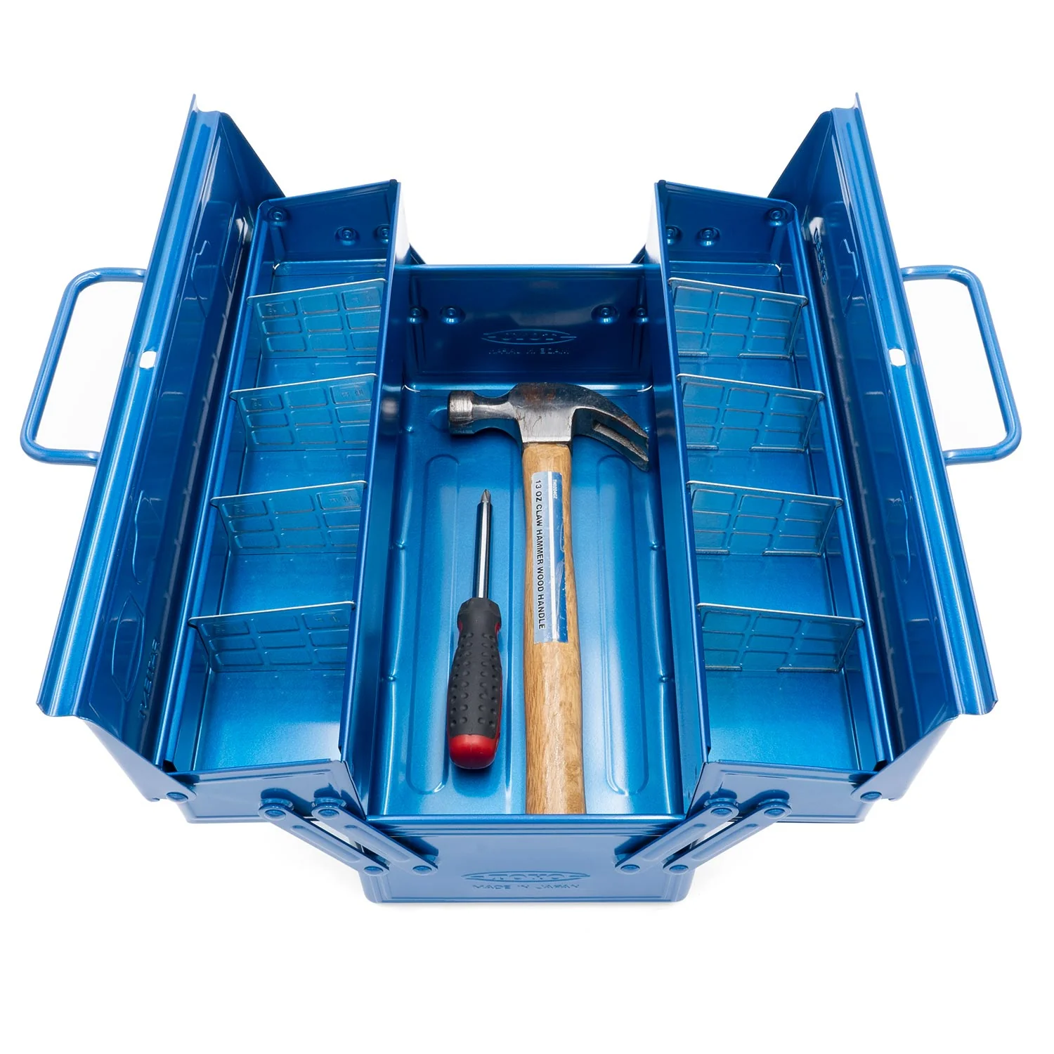 From toolbox specialist, Toyo Steel, a compact steel cantilevered toolbox. Features include plenty of room for storage, adjustable metal separators partitioning the two upper trays that allow easy separation of smaller items such as batteries, nails, screws, nuts, and bolts, a lower layer for storing larger tools, and a hole in the center of the upper lid to attach a padlock. Durable, sturdy, and lightweight, this toolbox was designed for convenience and portability. Â